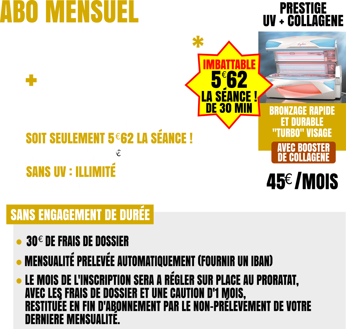 Le principe est simple : vous êtes prélevé chaque mois de votre mensualité, et vous avez accès à nos appareils de bronzage (SANS UV et Solariums).